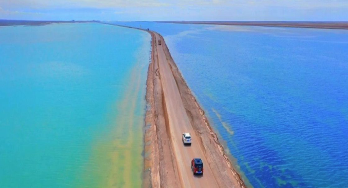 早餐後前往水上雅丹,途經西臺吉乃爾湖,一條公路把湖水分開,兩邊的湖水,一邊綠色,一邊藍色涇渭分明,濱湖為第四系洪積、沖積、風積、湖相碎屑沉積和鹽類化學沉積。停車拍照。