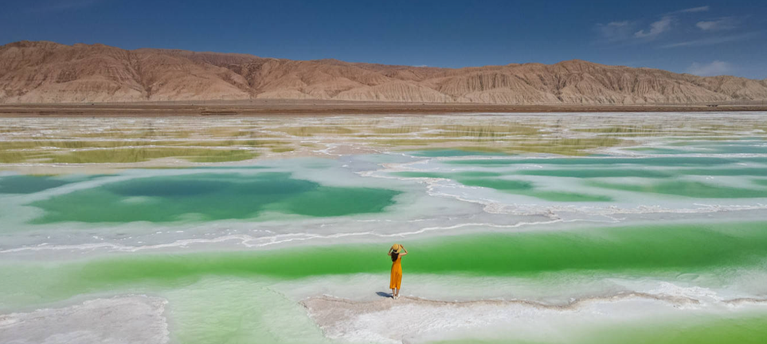 早餐後參觀翡翠湖,翡翠湖位於青海省海西蒙古族藏族自治州原大柴旦化工廠鹽湖採礦區內。因湖水在陽光下清澈湛藍,色如翡翠,故得名“翡翠湖”。