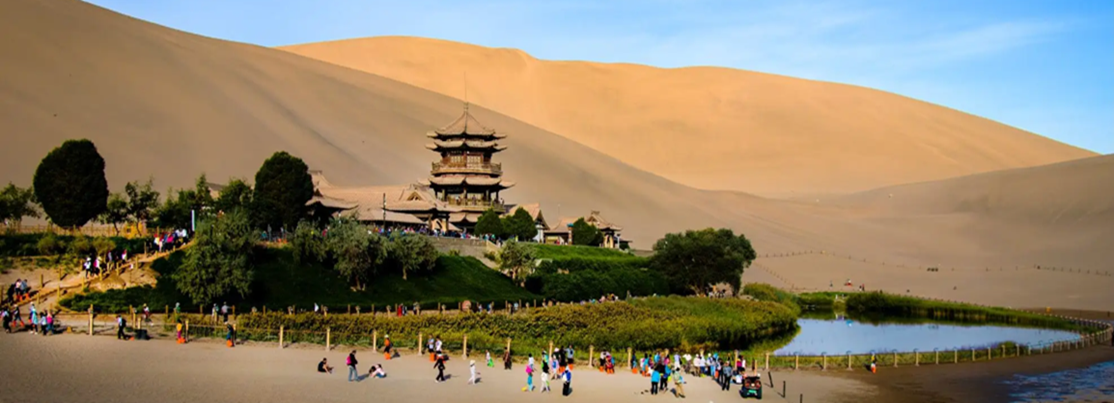 前往參觀敦煌【鳴沙山月牙泉】,鳴沙山古稱神沙山,為一沙漠地帶,鳴沙山之名由來傳說眾多,其中一段較為生動:古有一將軍率軍出征至此兵敗,全軍覆沒,屍積數萬,一夜之間狂風大作,流沙覆蓋,聚沙成丘,人馬踏之,聲若雷鳴,故名。您可以在鳴沙山騎乘駱駝於大漠,自費體驗滑沙或越野車衝浪,體驗在敦煌飆沙的樂趣,提醒您將相機包好,小心相機進沙呦! 月牙泉在鳴沙山懷抱之中,顧名思義,她因形似月牙而得名,茫茫大漠之中此泉永不幹凅、沙填不滿,實乃一大奇景。