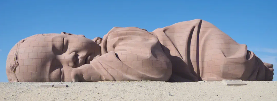 《大地之子》雕塑位於甘肅省瓜州縣戈壁灘上,雕塑長15米、高4.3米、寬9米,以紅砂岩為主要材質,利用三維掃描獲取模型數據,再分塊進行3D雕刻,最後逐塊雕砌安裝成型的大型戶外主題雕塑作品。