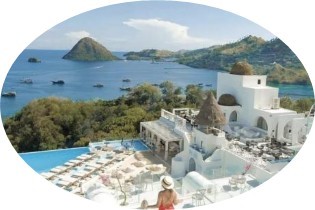 ② 小聖托裡尼: 這是一間典雅的希臘風格聖托裡尼主題飯店。登機前,我們在這裡一邊欣賞拉布安海灣的美麗景色,一邊享用一頓精緻的午餐。午餐後,搭乘印尼內陸航班直飛印尼首都雅加達。