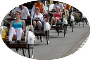 ②傳統人力三輪車:搭車一個半小時後,我們將進入日惹市區,在此貴賓們將改坐人力三輪車遊覽皇宮區域。
