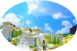 ①下機後,搭車約50分鐘來到西婆厚隆溫泉。此溫泉以其白色的石灰岩地形和溫泉湖而聞名。這些石灰岩由地熱活動和礦物沉積形成,顏色從白色到淺黃色,甚至有些呈現淡粉紅色,與著名的土耳其棉花堡(Pamukkale)有異曲同工之妙。