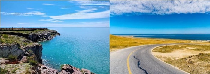 遊覽:青海湖斷崖(遊覽約1.5小時)(也稱“聖泉灣”),緊鄰315國道,是俯瞰青海湖絕佳地點 。青海湖斷崖是青海湖北岸剛察縣聖泉灣景區內的獨特地質景觀,以紅色斷崖碧湖相映、湟魚洄游奇觀和藏族祭海文化為特色,景區全年開放。紅色砂石斷崖垂直高度達數十米,形成於地質運動與湖水侵蝕,懸崖與湖水相接具有強烈視覺衝擊。